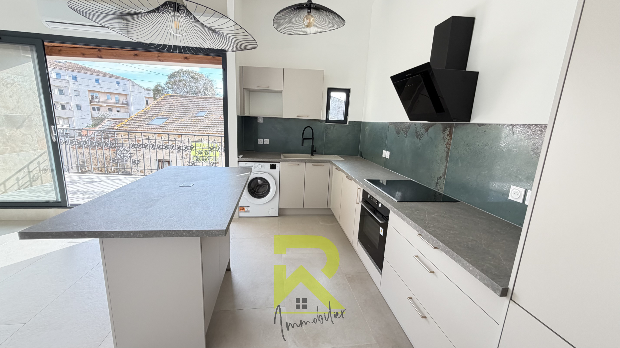 Cuisine entièrement refaite et équipée à neuf : réfrigérateur, four, hotte, plaque vitrocéramique, lave-linge, lave-vaisselle