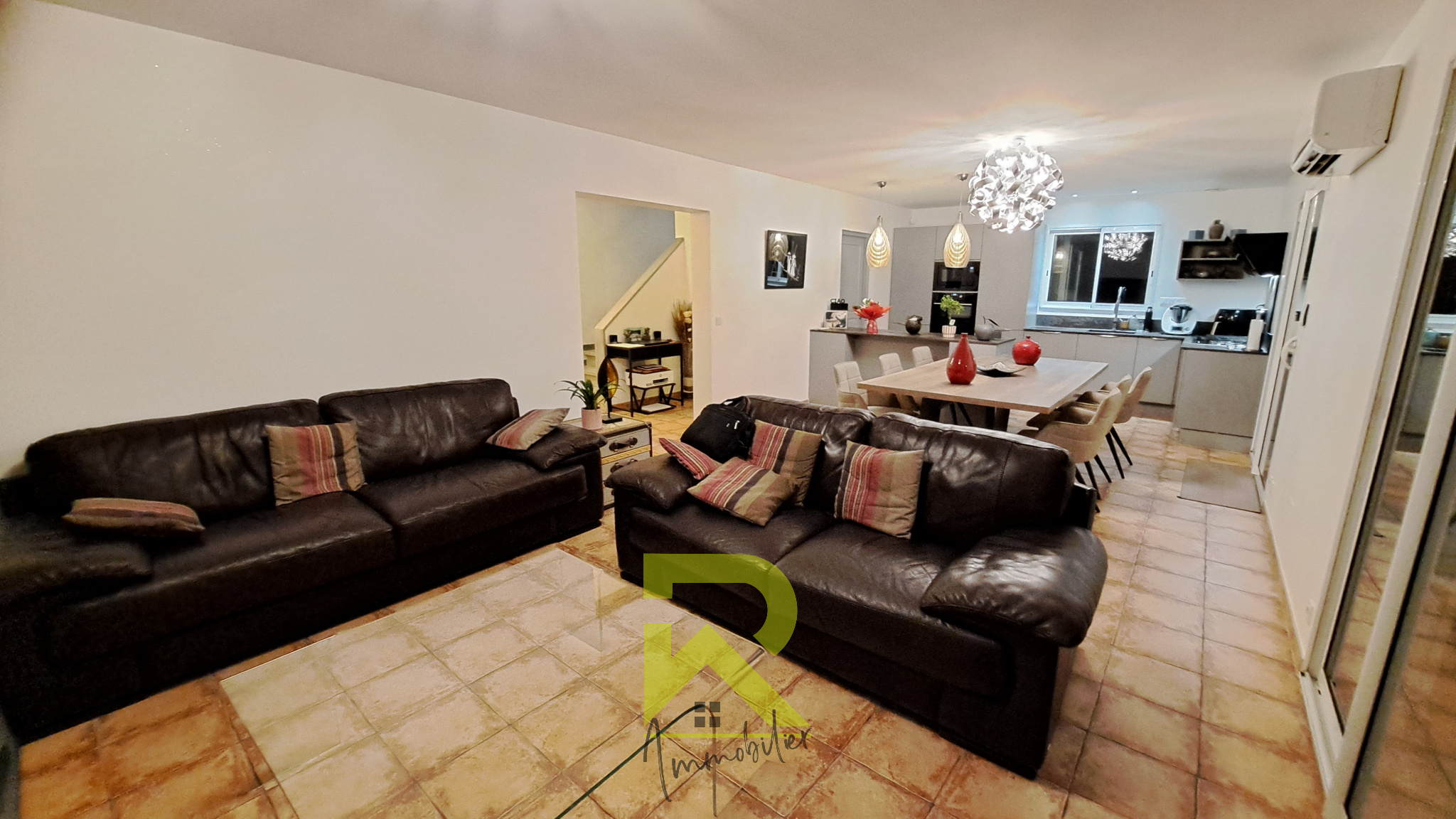 La pièce de vie, généreuse et baignée de lumière, se compose :